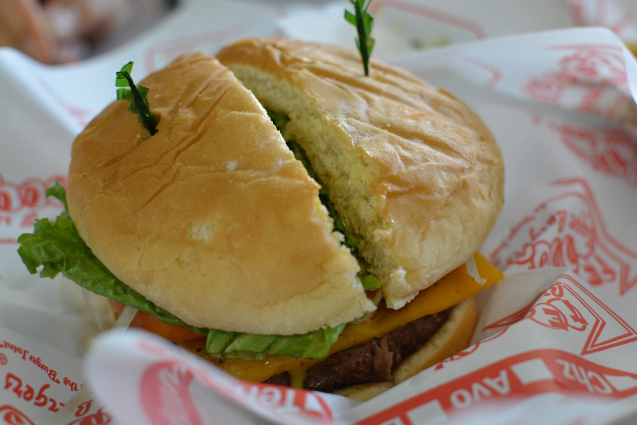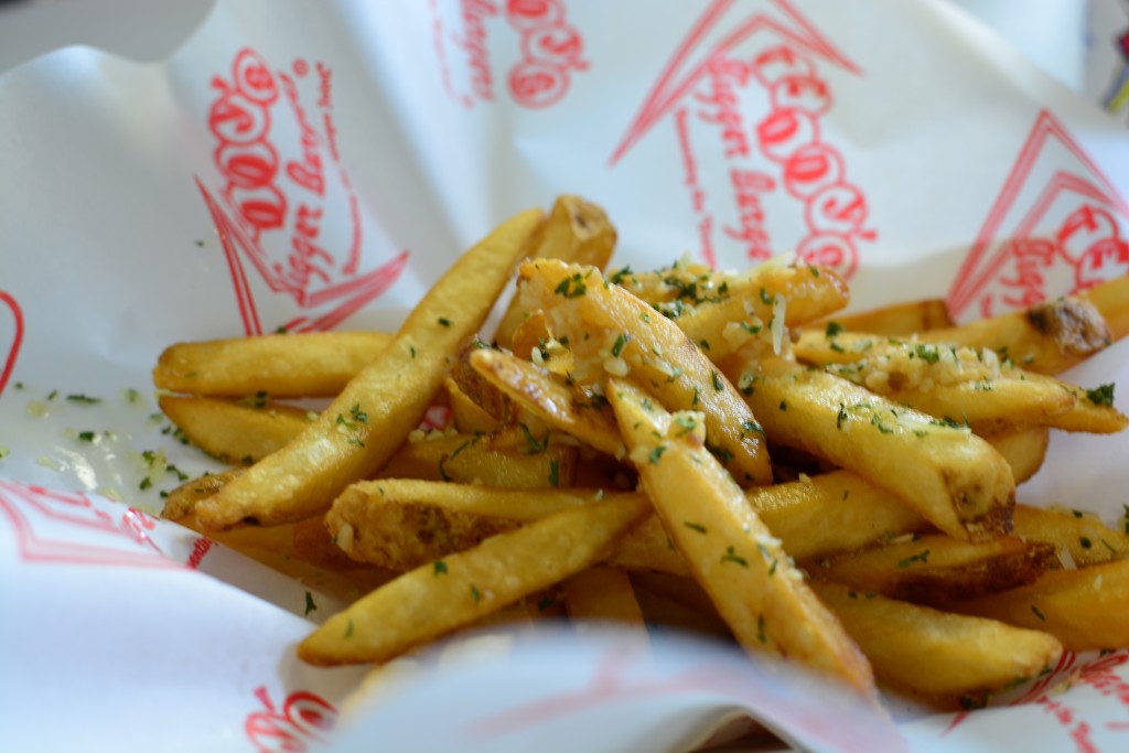 ベーコンアボカドビーフバーガーとガーリックバターフレンチフライを